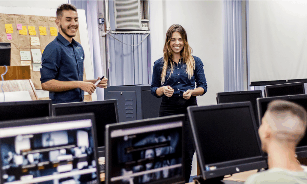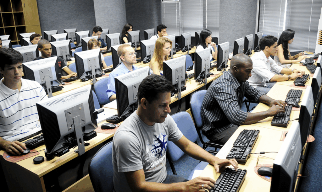 Todo o seu curso é em laboratórios modernos, com um computador por aluno e software das maiores empresas do mundo, garantindo uma experiência real de desenvolvimento.